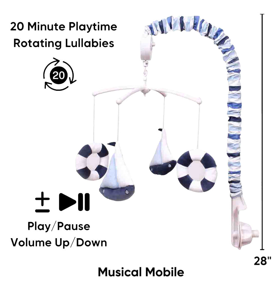 • 10 Piece Crib Bedding Set includes: 1 reversible crib comforter, 2 fitted crib sheets, 1 crib skirt, 1 diaper caddy, 1 musical mobile, 1 window valance, and 3 wall hangings