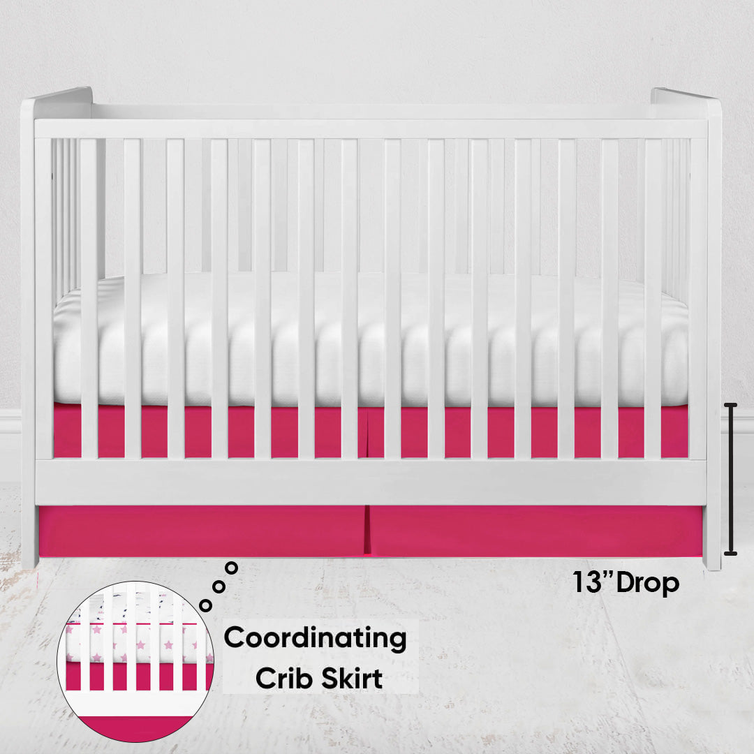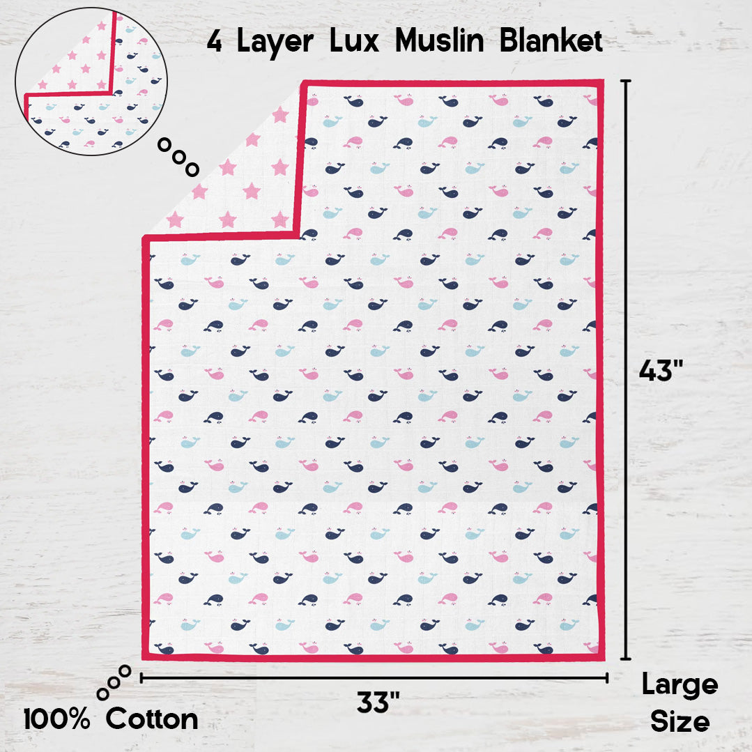 Welcome your little explorer home to the Whales Pink Blue 3 Piece Baby Girl Crib Bedding Set. This 3 piece crib set includes one reversible 4-layer lux blanket, one crib fitted sheets and one cotton percale crib skirt. Our signature whales print includes a mix pink, blue, and navy whales. This elegant nursery crib set is made from 100% cotton muslin that is soft and breathable. The reversible 4-layer lux muslin blanket (33" x 43") is a perfect addition to this set. One side has the whales pattern, and the other side has a color coordinating pink star print. The blanket is wrapped in a stylish red border. The muslin cotton crib fitted sheet has a matching boats pattern with pink cording and pink stars on the side (52" x 28" x 6"). With an elastic on all four corners, the sheets offer a safe and secure fit on a standard size crib mattress. The corner elastic also makes midnight changes a breeze. A cotton percale crib skirt in bright pink adds a touch of sophistication with a 13 inch drop (52" x 27"). The whole set is machine washable and gets softer with every wash. The Whales Pink Blue Grey Collection offers a host of coordinating accessories for your baby girl's nursery.
