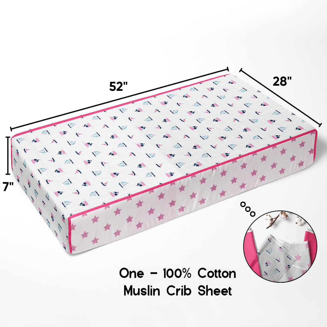 - Includes a snug and secure muslin crib fitted sheet with our nautical ocean themed pink boats