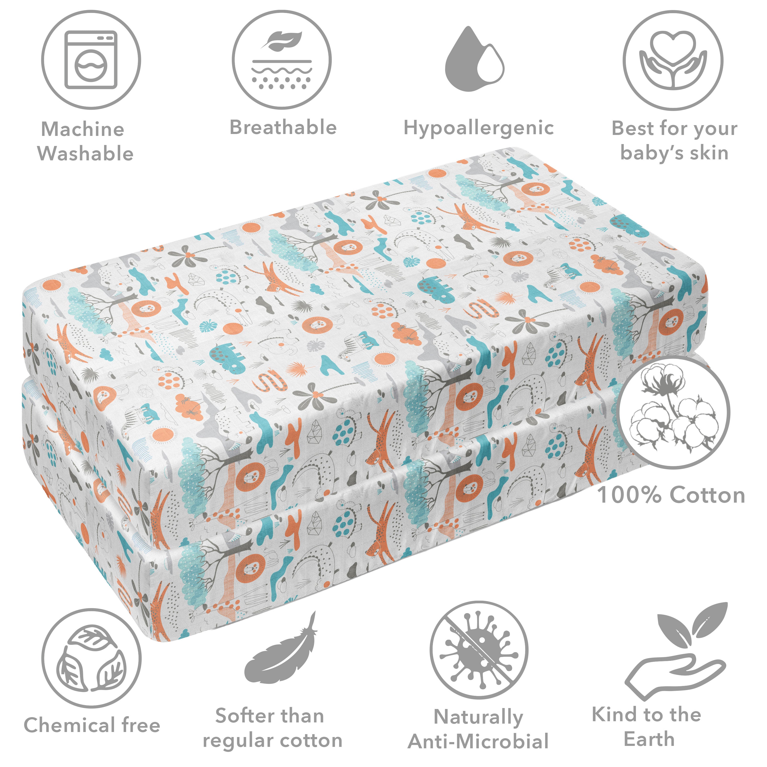 Bacati - Jungle Safari Serengeti Muslin Fitted Crib Sheet Aqua Orange Gray