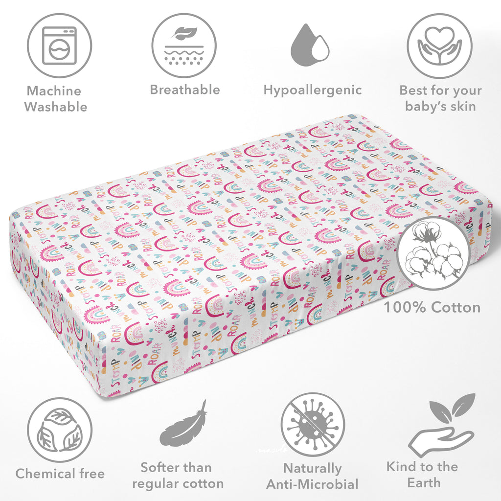 Bacati - Girls Little Dino Rainbow Pink Fuchsia Orange Muslin Crib or Toddler Bed Fitted Sheet