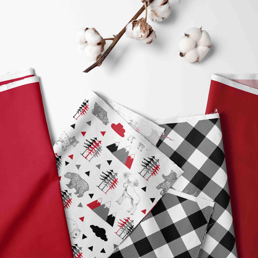 Lumberjack Red/Black/Gray Gender Neutral or for Boys or Girls. Browse our curated collection featuring an array of woodland crib bedding sets designed to offer baby soft comfort in styles that suit your nursery theme. Each piece is designed to spark joy and serenity in your baby's room. Scroll on to explore woodland nursery decor for your little one. Made with 100 percent cotton percale fabrics in buffalo plaids and printed fabrics with Mountains, Pine trees, Bears, Bison, Moose, Fox, Owls, Hedgehog, with embroidered details like "Adventure is out there", "We love you beary much", "Never stop Exploring" Patchwork Comforter, wall hangings and baby blankets theme baby to toddler bedding collection. Made with 100 percent cotton percale fabrics which are great for your child's delicate skin.