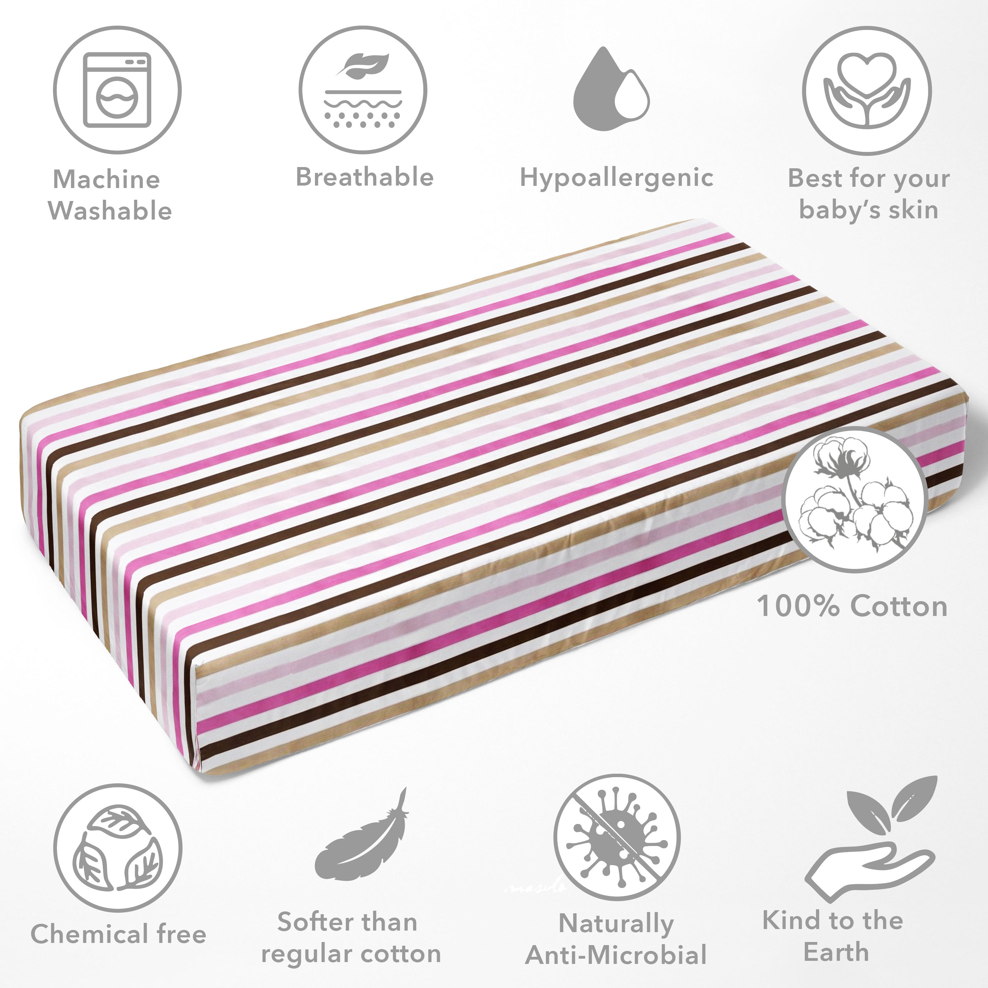 Bacati - Crib or Toddler Bed Fitted Sheet 100% Cotton Percale, Mod Stripes, Pink/Fuchsia/Beige/Brown