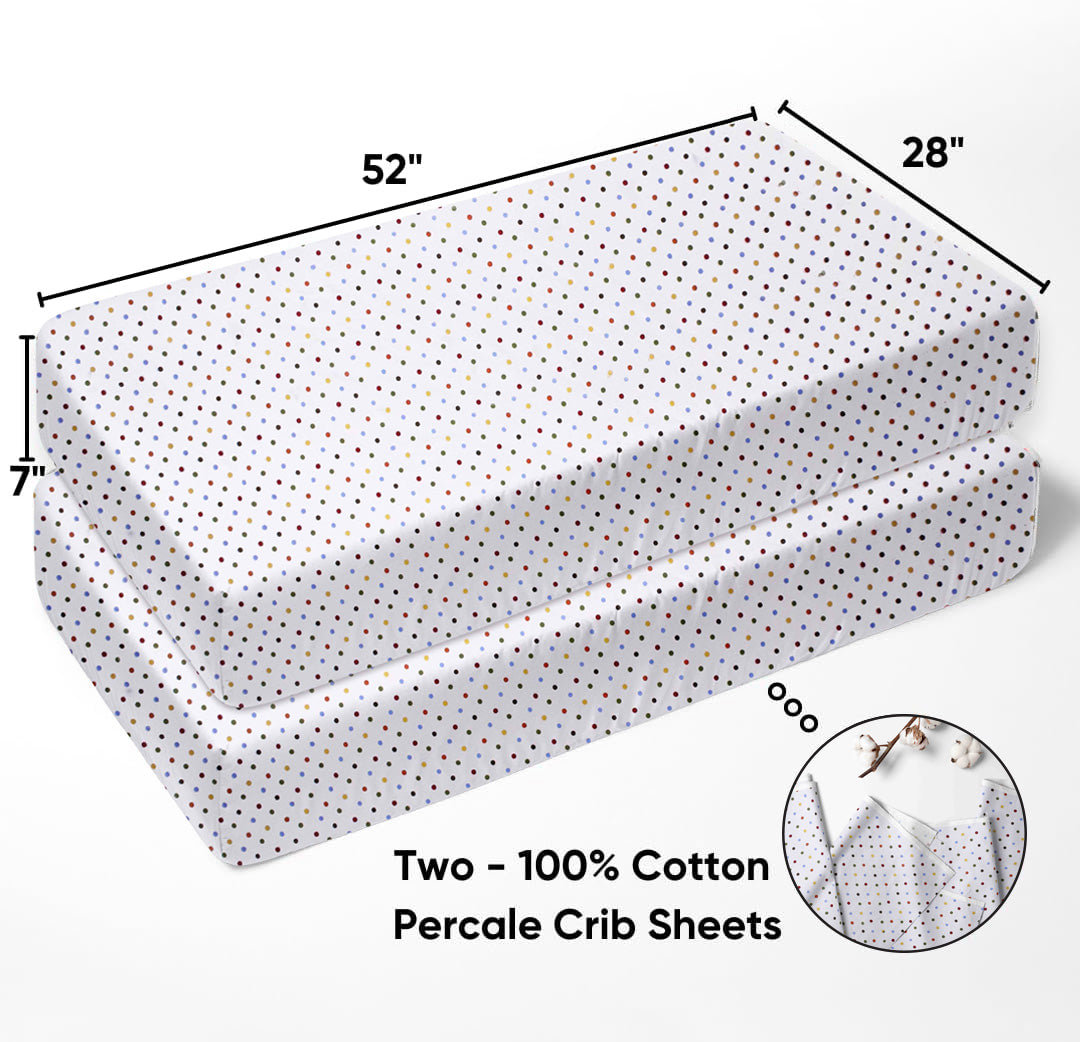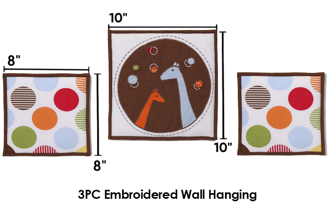 The 10 Piece Crib Bedding Set includes: a reversible crib comforter, 2 fitted crib sheet, crib skirt, diaper caddy, window valance, musical mobile, & 3-piece wall hangings. The reversible comforter (43” x 33”) includes our signature Bacati themes. The comforter is 100% cotton percale and is filled with a polyester batting making it about 1” thick. You’ll also get a set of our gorgeous 3-piece wall hangings (10” x 10”)! Included is TWO 100% cotton breathable fitted crib sheet (53” x 28” x 6”) along with a nursery window valance (54” x 15” drop fit for a 3” rod pocket and has a 1” header). As a perfect addition to the set, a 4-sided crib skirt is included (52” x 27”). The diaper stacker (20” x 12” x 8”) has a capacity to hold 24-36 newborn diapers. Top all that off with a 4-toy, electronically controlled musical mobile, & your Bacati themed nursery is pretty much complete! Finish out your beautiful nursery theme with additional accessories sold separately, such as an extra fitted sheet, changing pad cover, activity gym, storage solutions, & much more!