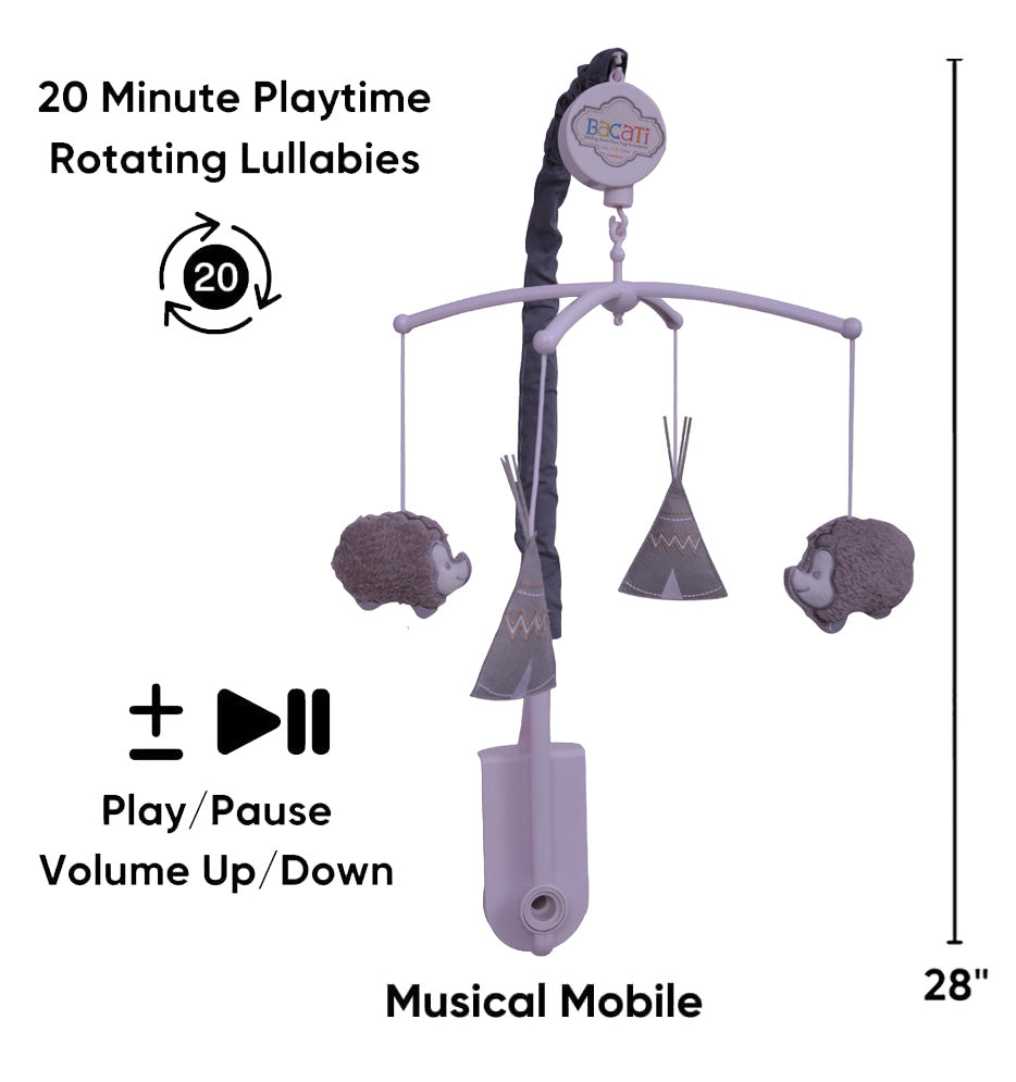 The 10 Piece Crib Bedding Set includes: a reversible crib comforter, 2 fitted crib sheet, crib skirt, diaper caddy, window valance, musical mobile, & 3-piece wall hangings. The reversible comforter (43” x 33”) includes our signature Bacati themes. The comforter is 100% cotton percale and is filled with a polyester batting making it about 1” thick. You’ll also get a set of our gorgeous 3-piece wall hangings (10” x 10”)! Included is TWO 100% cotton breathable fitted crib sheet (53” x 28” x 6”) along with a nursery window valance (54” x 15” drop fit for a 3” rod pocket and has a 1” header). As a perfect addition to the set, a 4-sided crib skirt is included (52” x 27”). The diaper stacker (20” x 12” x 8”) has a capacity to hold 24-36 newborn diapers. Top all that off with a 4-toy, electronically controlled musical mobile, & your Bacati themed nursery is pretty much complete! Finish out your beautiful nursery theme with additional accessories sold separately, such as an extra fitted sheet, changing pad cover, activity gym, storage solutions, & much more!