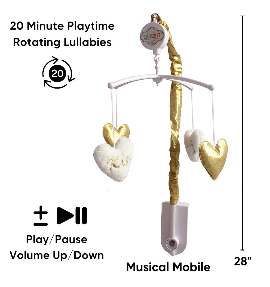 Musical Mobile: Saving the best for last, our redesigned mobile features a various soothing lullaby. It comes with Music Box with 10 different tunes with tune selector besides power switch so you can play or shut off the music. You can also adjust the volume to your child’s liking. Requires 2 AA Batteries not included.