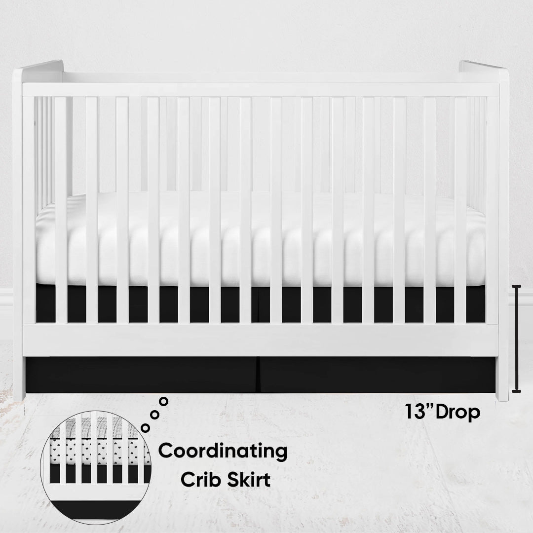Crib Skirt / Bed Dust Ruffle: Adding a pop of color to your nursery, the crib skirt features simple yet classic print. It is perfect for a US standard sized crib. Dimensions: 52 x 27 inches Deck with 13 inches Drop