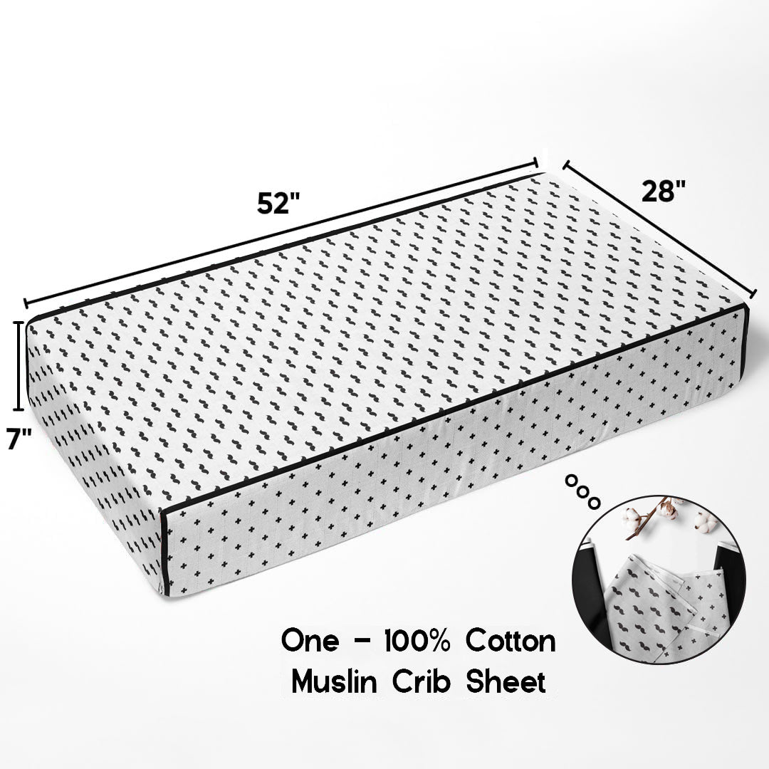 8 pc Crib Set with Crib Rail Guard: Reversible 4 layered Muslin Lux Blanket/Playmat, Four Muslin Swaddling Blankets(4), Long Side Crib Rail Guard (1), Fitted Crib Sheet (1) and Crib Skirt/Bed Dust Ruffle