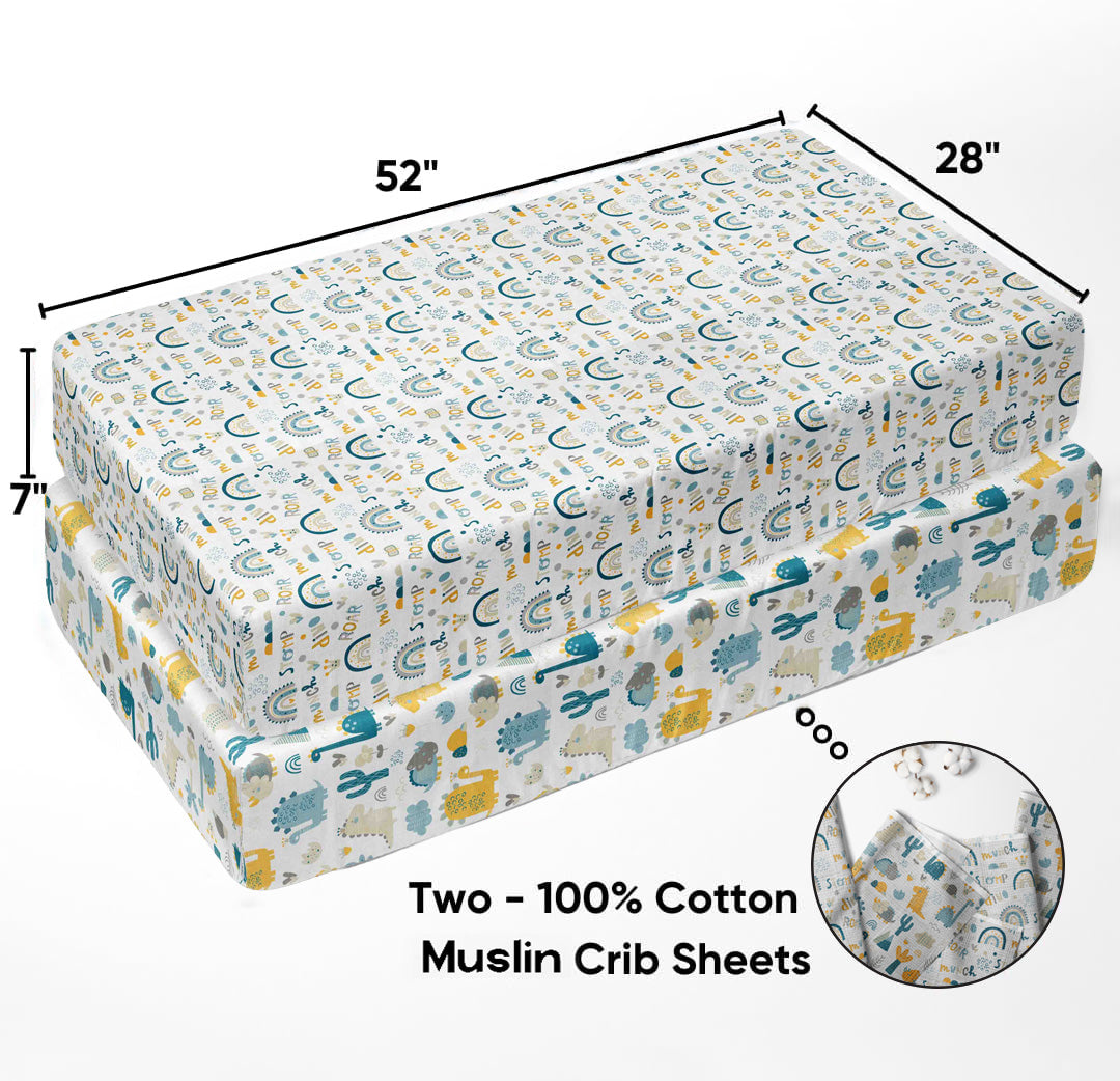 5 pc Crib Set with with Crib Rail Guard: Reversible 4 layered muslin Lux Blanket, Long Side Crib Rail Guard (1), Muslin Fitted Crib Sheets (2) and Crib Skirt/Bed Ruffle.