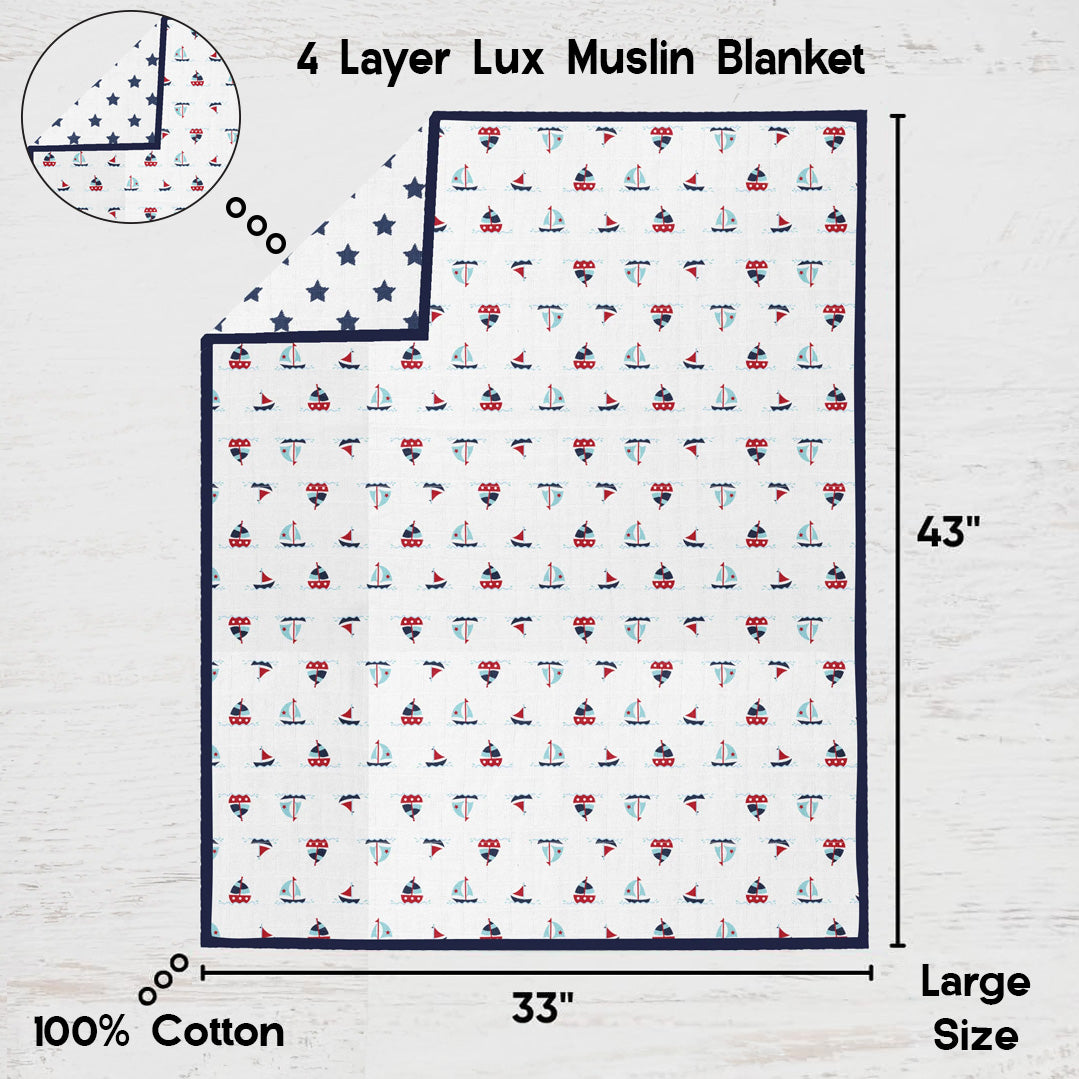 Reversible 4 layers of Muslin Lux Blanket/Playmat: The reversible Lux Blanket/playmat features Bacati Coordinated Signature Prints on both sides with solid border to accentuate the look. The Lux Blanket/playmat large enough, which allows for several years of use before it is outgrown. Ideally to be used as playmat for playtime/tummy time, bonding with parents and later as a toddler comforter. Dimensions: 33 x 43 inches with 4 layers of muslin fabric