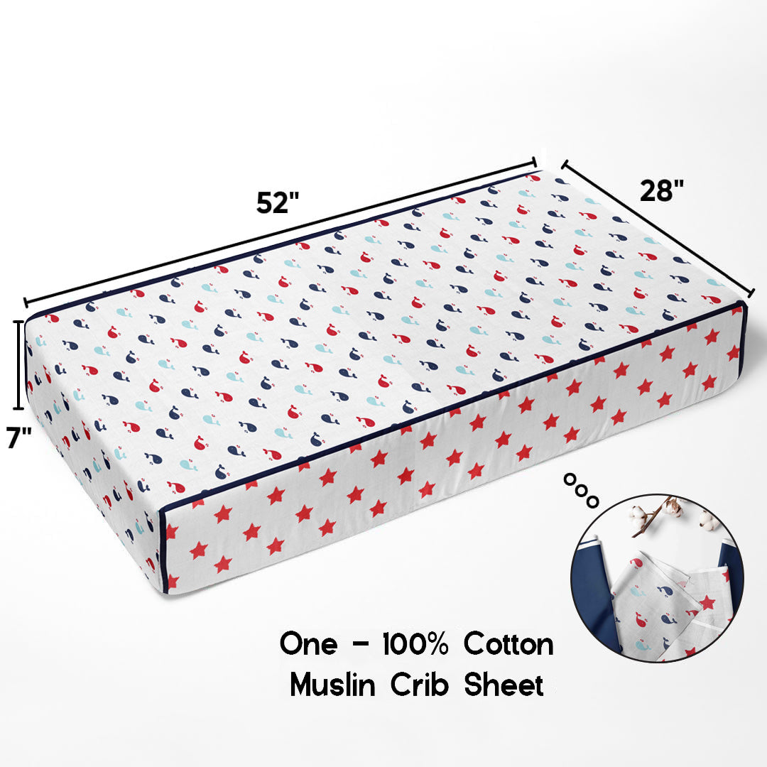 This Bacati crib set adds a whimsical touch to your precious child's nursery. Bacati is known for its fun, colorful, and signature fabrics and prints. In this collection, we bring you a charming, cozy boats and whales in blue navy and red. The nursery set includes everything you need for newborn & infant nursery décor, plus form AND function!
