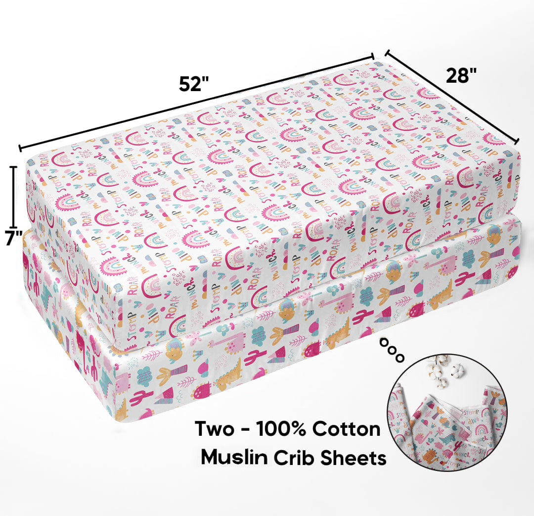 Muslin Crib Fitted Sheet: On the crib fitted sheet, your little one will enjoy dreaming on top of the 100 percent cotton percale in Bacati Signature Print. With elastic around the top and bottom corners for added safety/fit, the crib sheet perfectly sized to ensure the snug fit around a US standard size crib mattress without mattress pads. Dimensions: 53 x 28 x 6 inches