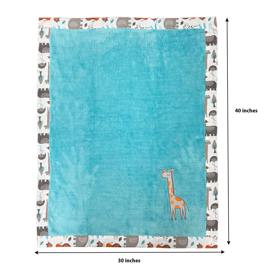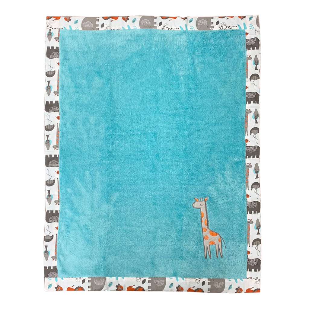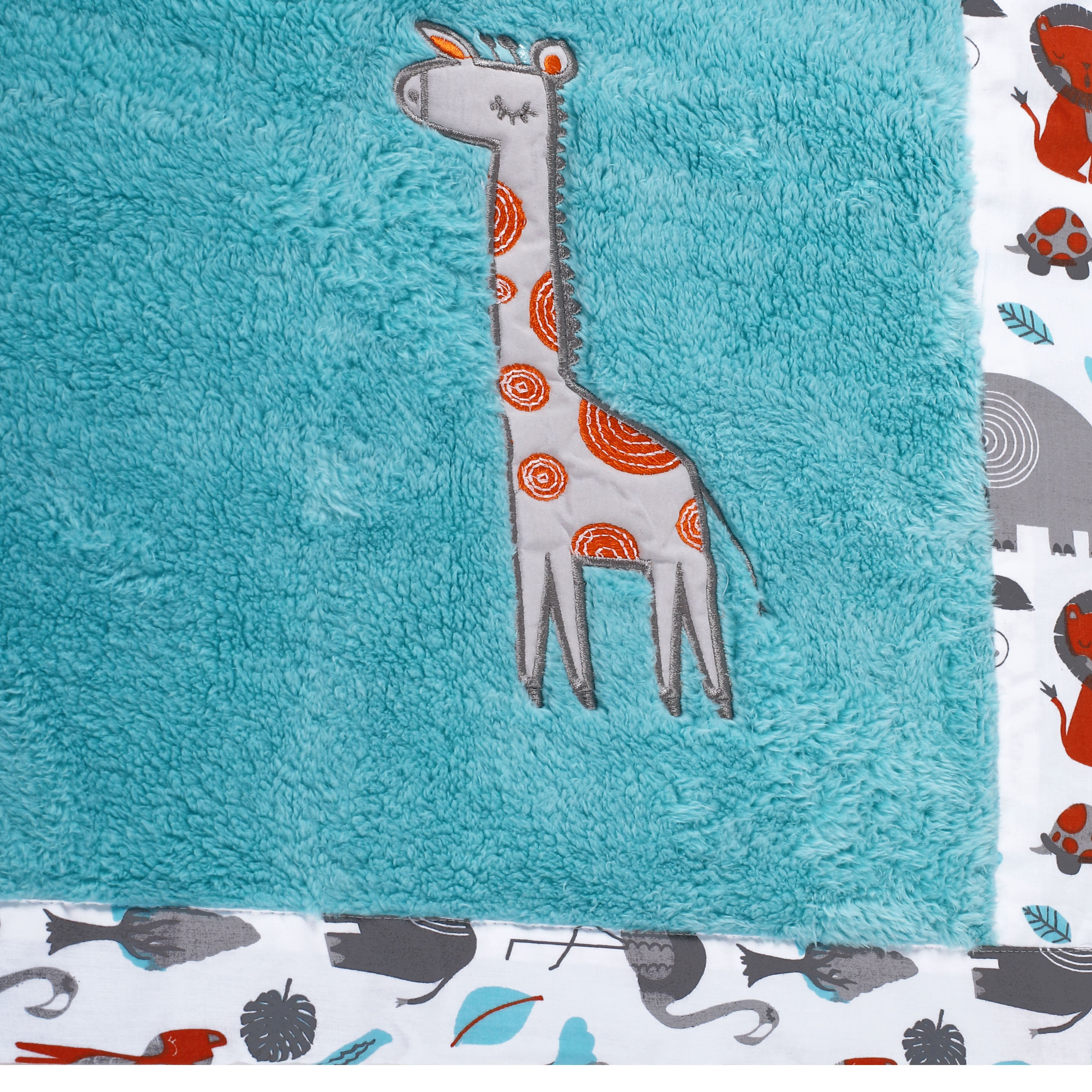Bacati - Embroidered Baby Plush Blanket, Jungle Safari Animals Aqua/Orange/Grey