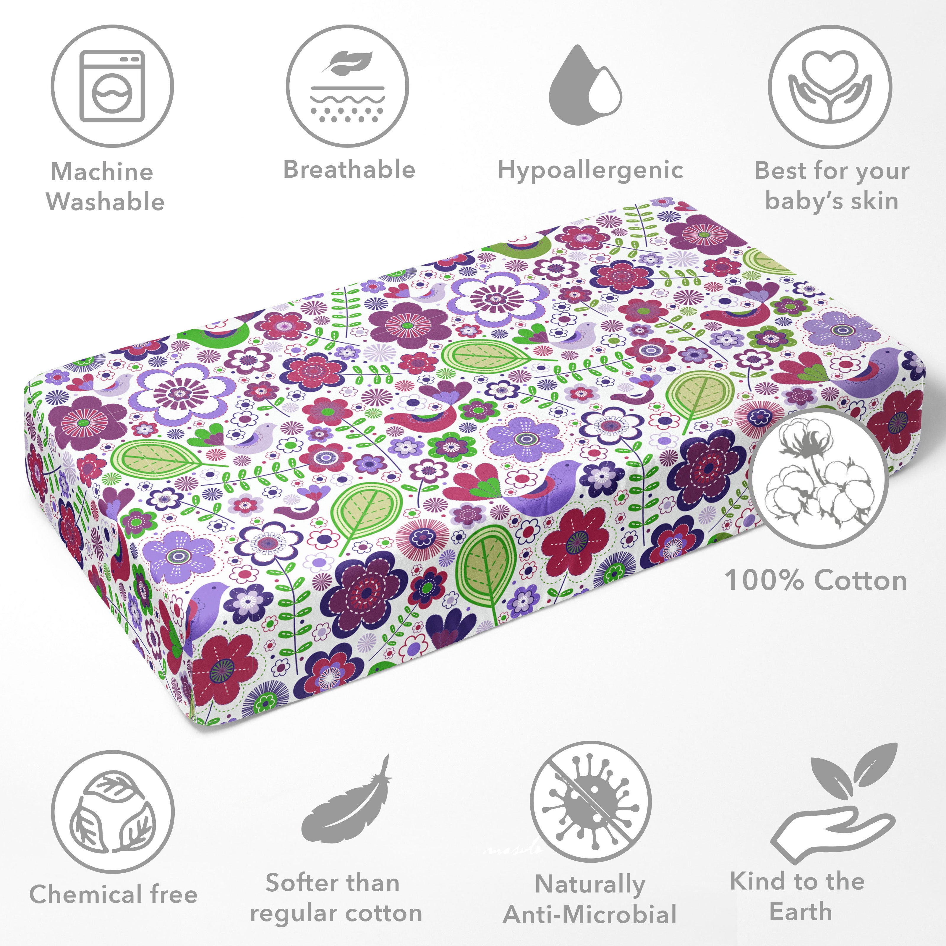 Bacati - Crib or Toddler Bed Fitted Sheet 100% Cotton Percale, Botanical, Purple/Lilac/Green/Plum