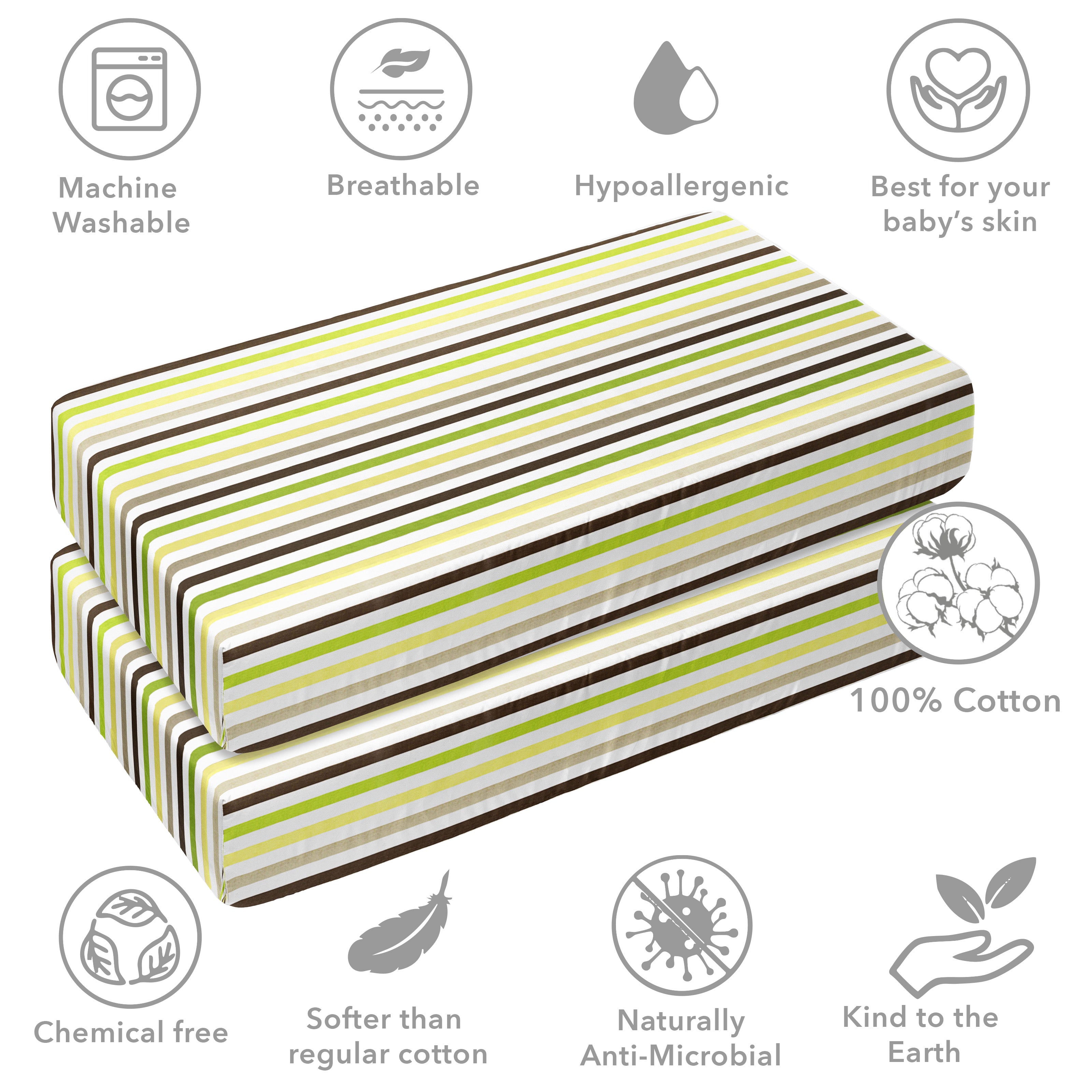 Bacati - Crib or Toddler Bed Fitted Sheet 100% Cotton Percale, Mod Stripes, Green/Yellow/Beige/Brown