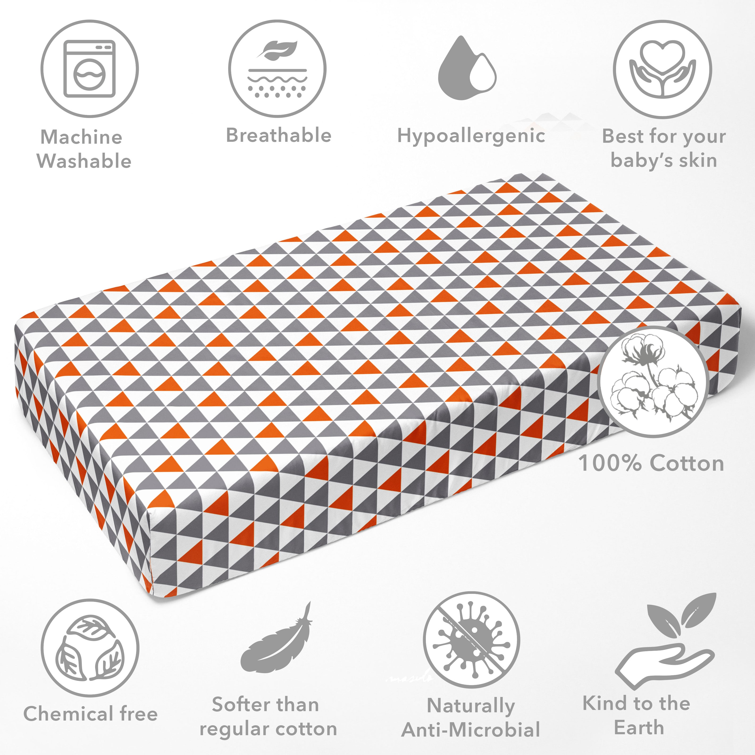 Bacati - Crib or Toddler Bed Fitted Sheet 100% Cotton Percale, Playful Fox Orange/Grey Triangles