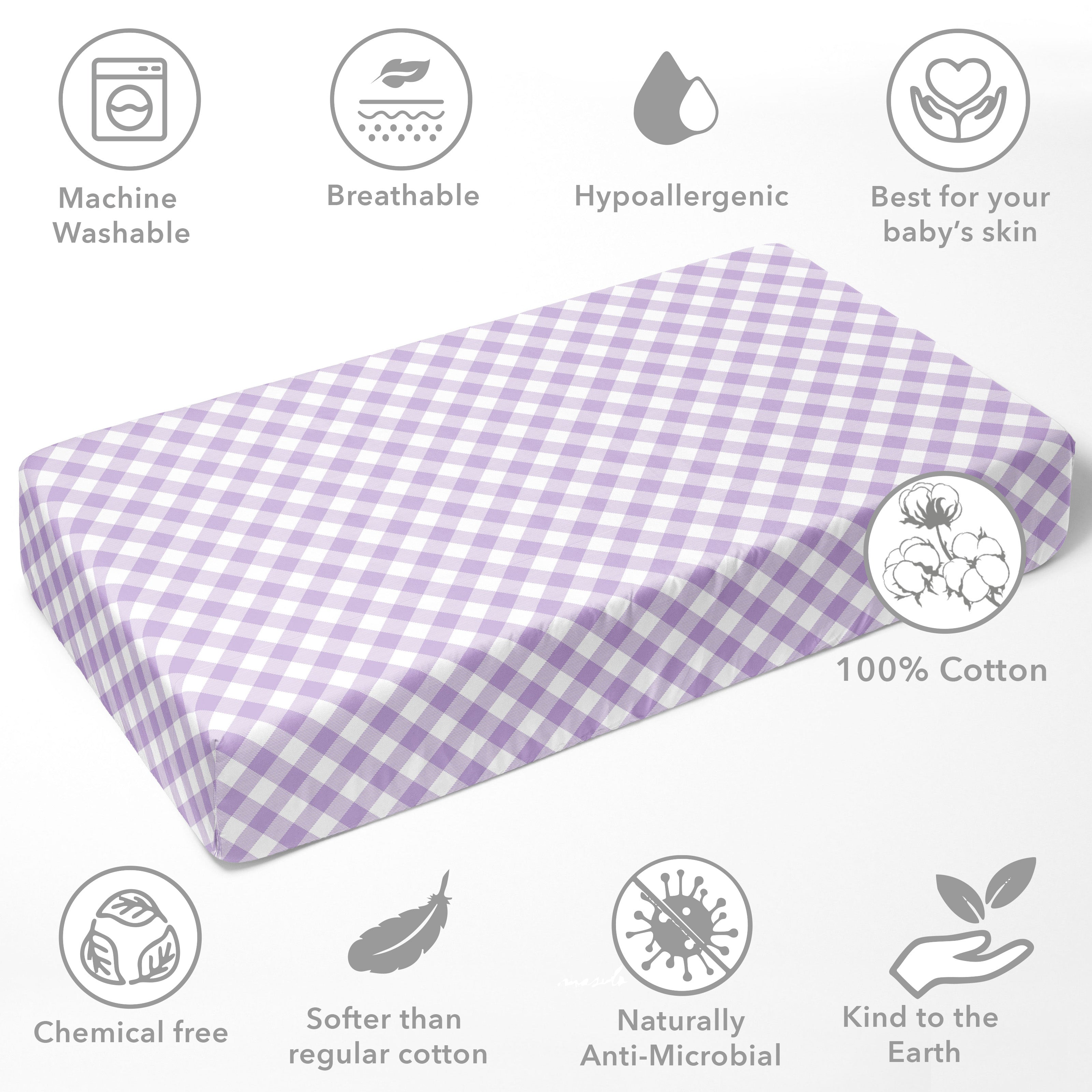 Bacati - Crib or Toddler Bed Fitted Sheet, Watercolor Flowers Purple Buffalo Plaids Print