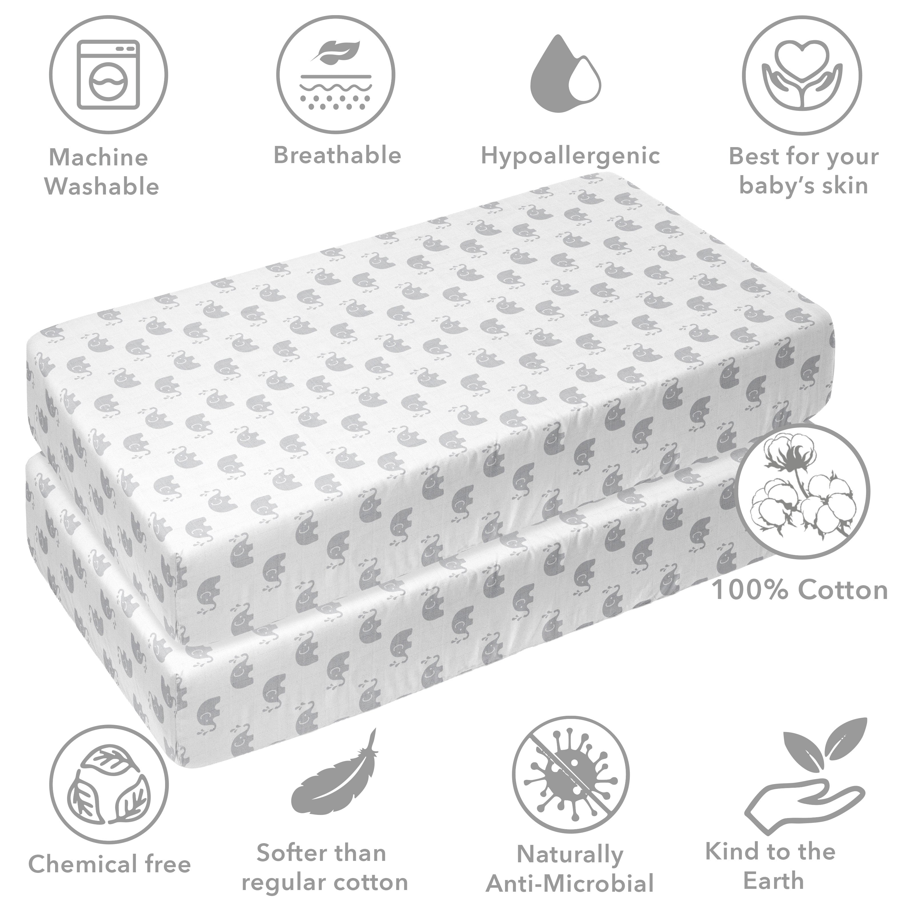 Bacati - Elephant Grey Muslin Crib or Toddler Bed Fitted Sheet 100% Cotton Muslin