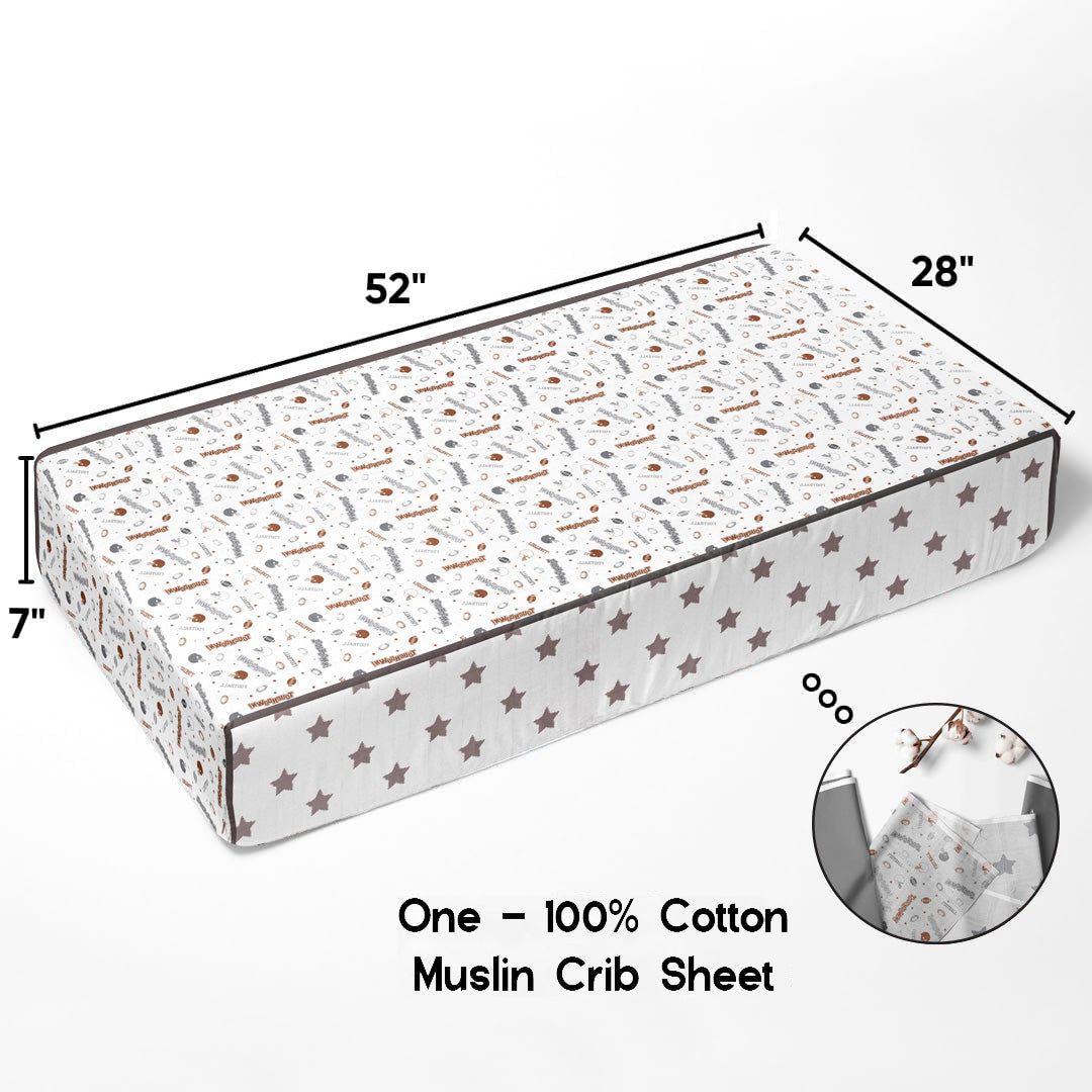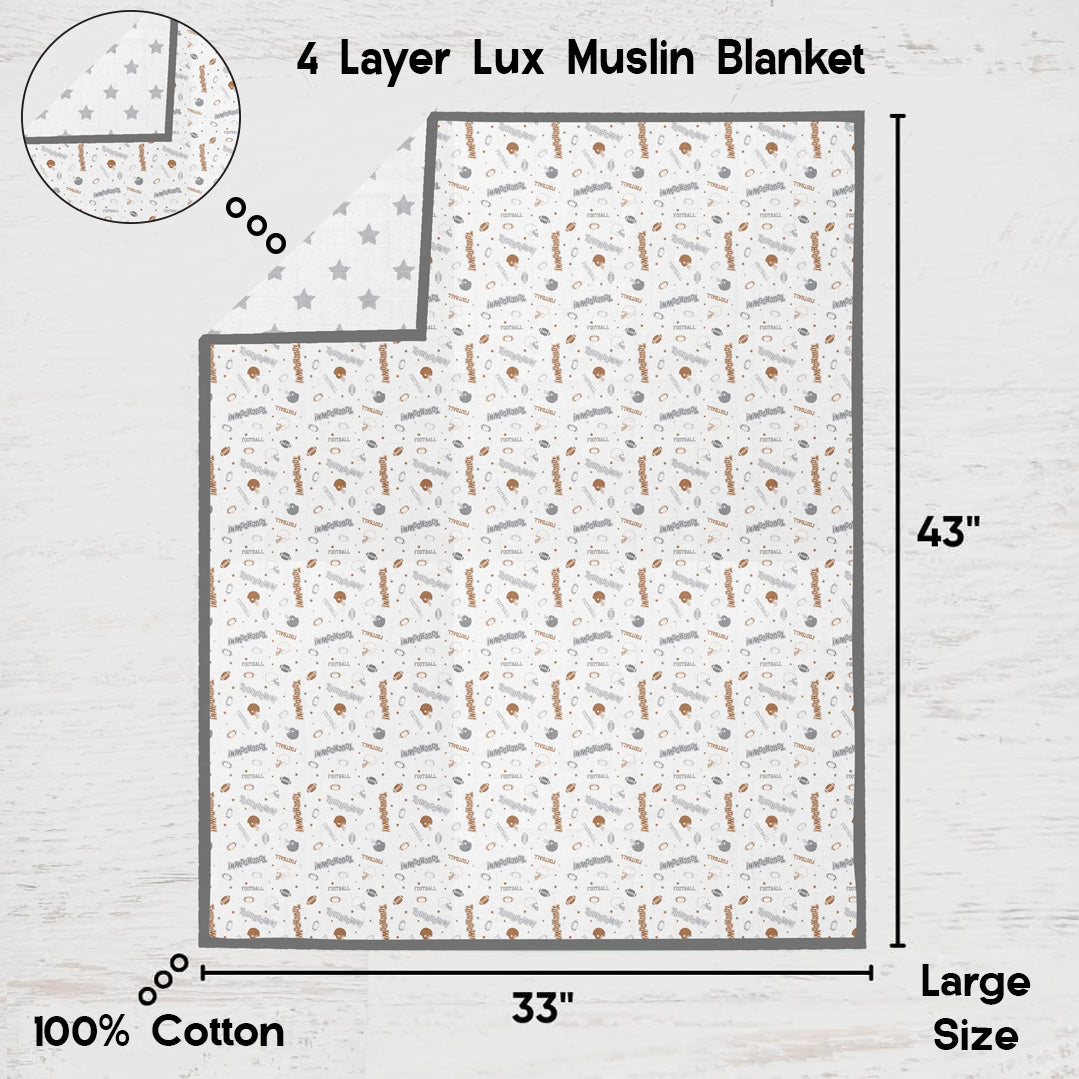 Welcome your newborn to a world of comfort and playful style with the Bacati Football 3 Piece Baby Boy Crib Bedding Set. This set, ideal for Football enthusiasts, offers a perfect blend of coziness and modern nursery aesthetics. It features a reversible 4-layered muslin lux blanket/playmat adorned with a our signature football pattern on one side and grey stars on the other, making it ideal for both playful times and restful naps. The muslin crib fitted sheet is crafted with vibrant Football imagery and playful grey stars, ensuring a snug and secure fit for peaceful sleep. The set is elegantly completed by a cotton percale crib skirt/dust ruffle in sophisticated solid grey, offering a 13-inch drop that adds an elegant touch to your baby boy's crib. This set includes a crib sheet, crib bedding, and a crib comforter, all designed with the Bacati Football theme. Crafted from soft, breathable 100% cotton muslin, each item in the set provides a gentle touch against your baby's skin, ensuring comfort during sleep and play. The entire baby crib bedding set is part of the Bacati Football Muslin Collection, allowing for effortless coordination with other nursery accessories.