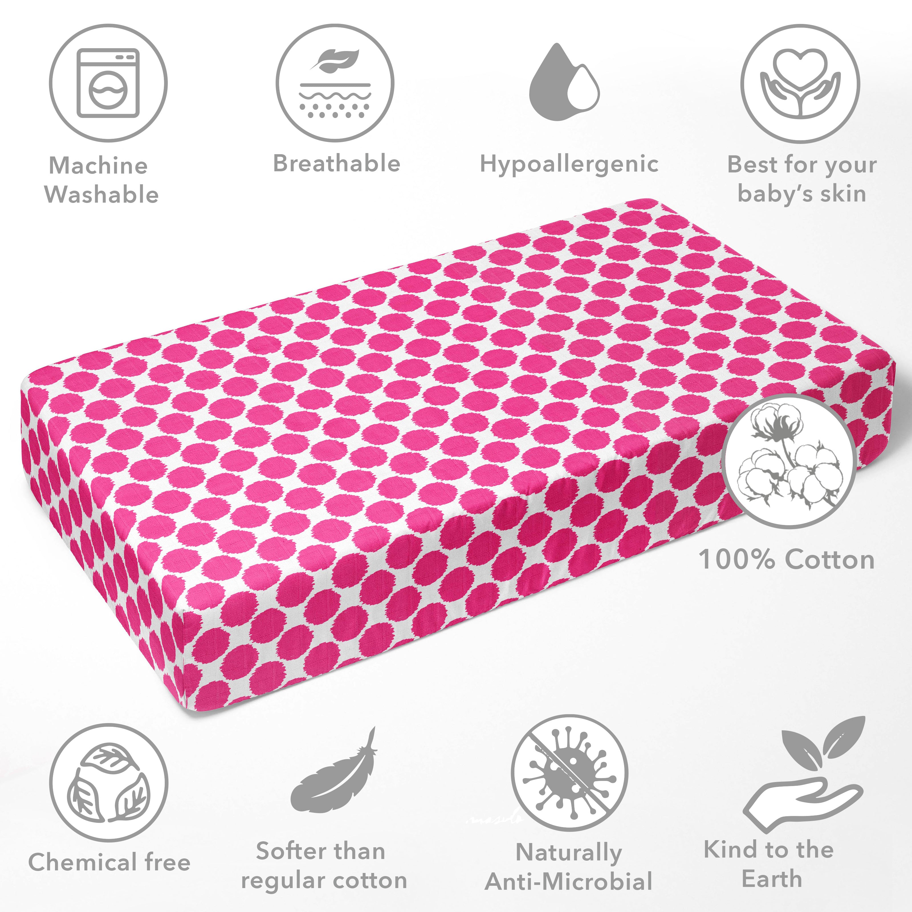 Bacati - Ikat Dots Pink Muslin Crib or Toddler Bed Fitted Sheet 100% Cotton Muslin