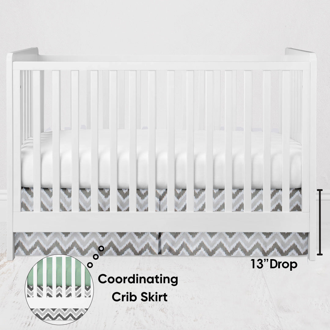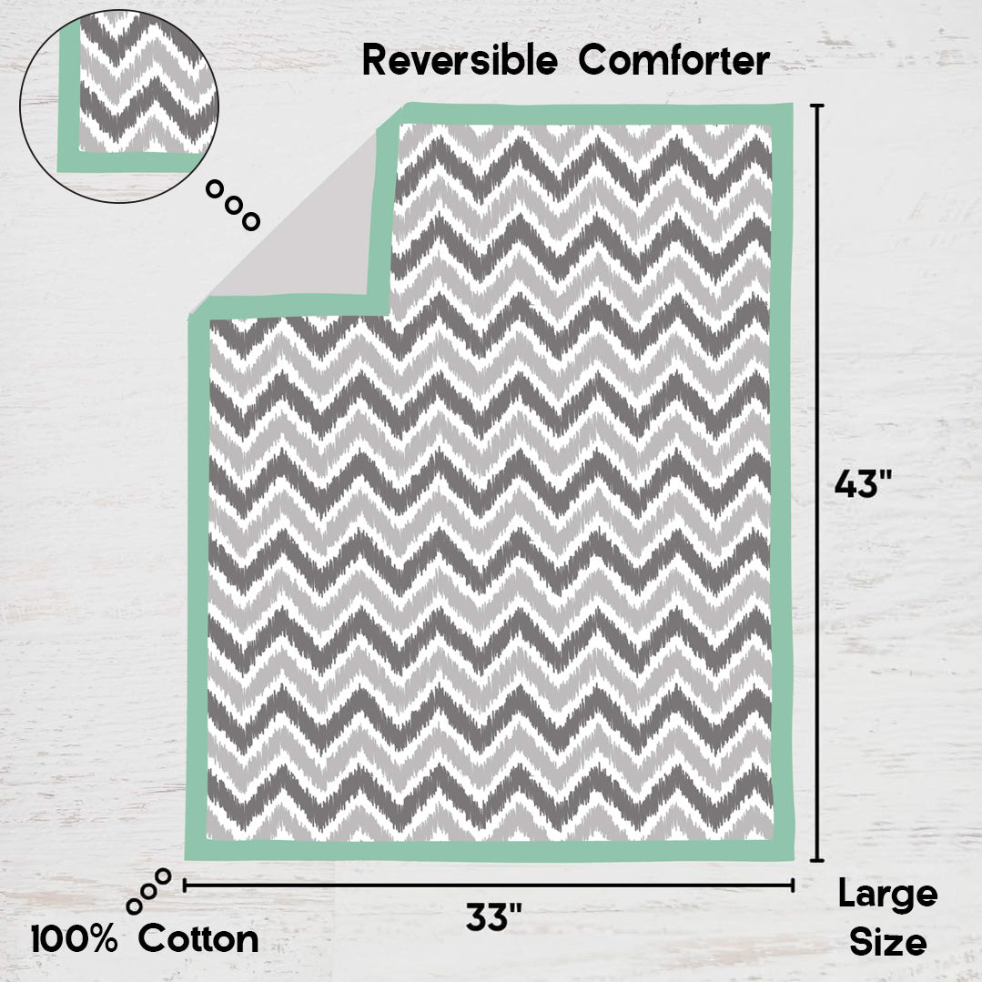 The 4 Piece Crib Bedding Set includes: a reversible crib comforter, fitted crib sheet, crib skirt & a diaper caddy. The reversible comforter (43” x 33”) includes our signature Bacati themes. The comforter is 4 layers of cotton muslin, making it about 1" thick. Included is a 100% cotton breathable fitted crib sheet (53” x 28” x 6”). As a perfect addition to the set, a 4-sided crib skirt is included (52” x 27”). To top it all off, the included diaper stacker (20” x 12” x 8”) has a capacity to hold 24-36 newborn diapers. Finish out your beautiful nursery theme with additional accessories sold separately, such as an extra fitted sheet, changing pad cover, activity gym, storage solutions, & much more!