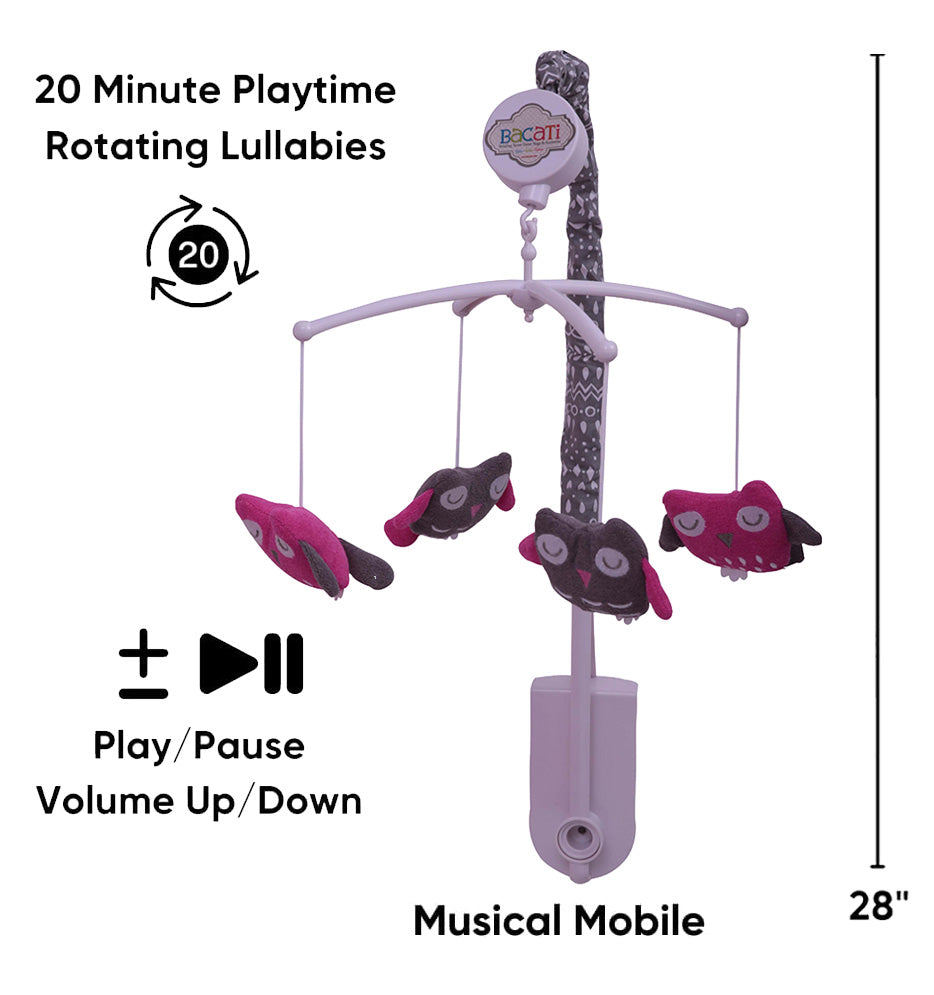 Bacati - Owls in the Woods Pink/Grey Musical Baby Crib Mobile