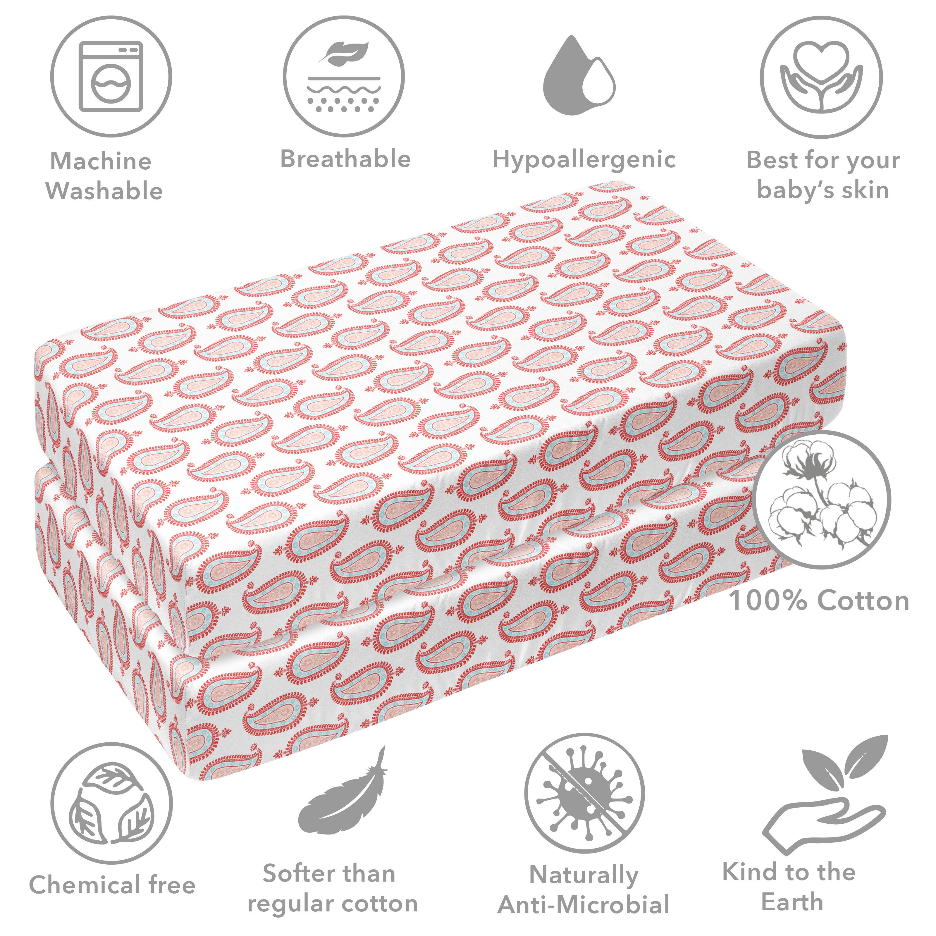 Bacati - Crib or Toddler Bed Fitted Sheet 100% Cotton Percale, Paisley Sophia Paisley Coral/Aqua