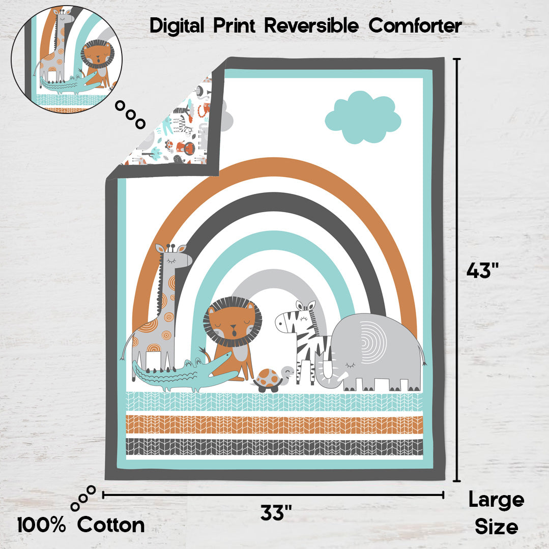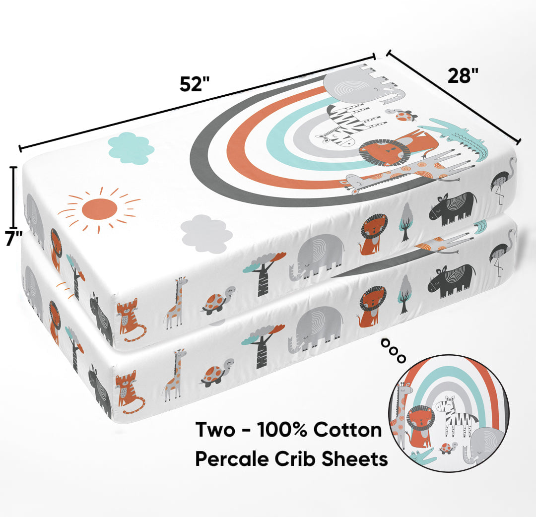 This Bacati crib set adds a whimsical touch to your precious child's nursery. Bacati is known for its fun, colorful, and signature fabrics and prints. In this collection, we bring you a charming, cozy Jungle Safari animals Tiger, Zebra, Crocodile, Hippo, Elephant, Giraffe, Turtle, Flamingo over the Rainbow theme in aqua, orange and grey. The nursery set includes everything you need for newborn & infant nursery décor, plus form AND function!